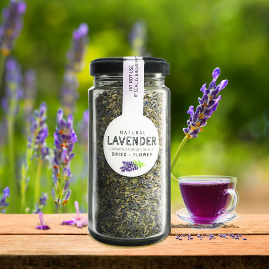 Kabeela Living Premium Lavender Flower Dried 30g Glass Bamboo Jar, Natural Sun Dried Lavender Flower Buds for Iced Tea, Baking, Bath, Stress Relief